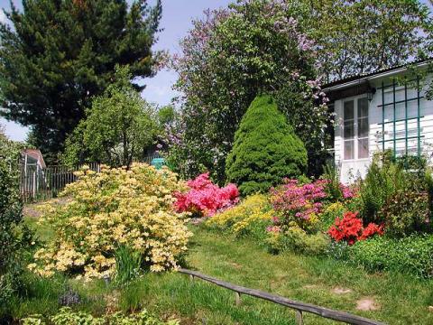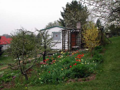 Gartenansichten - Garten mit Gartenlaube im Frühling