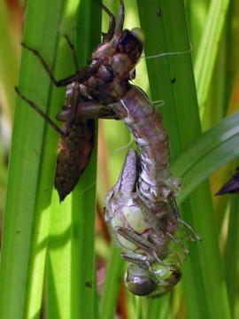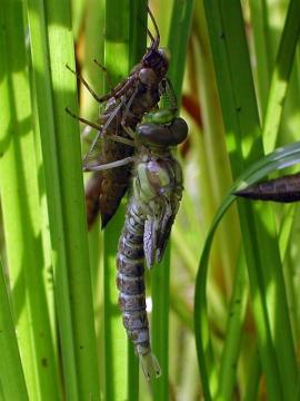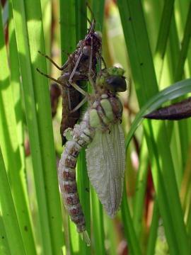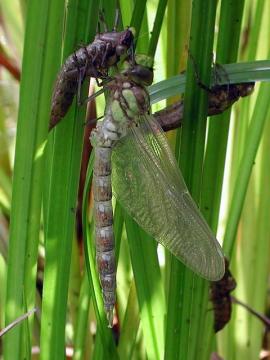 Eine blaugrüne Mosaikjungfer schlüpft aus ihrer Larvenhülle