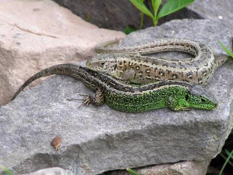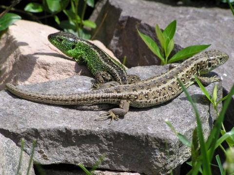 Zauneidechsenpaar (Lacerta Agilis) - Männchen grün, Weibchen braun